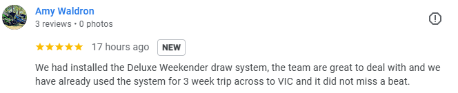Amy was thrilled with her new Reefwise Low Profile Canopy and shared this great feedback: “We had installed the Deluxe Weekender draw system, the team are great to deal with and we have already used the system for 3 week trip across to VIC and it did not miss a beat.”